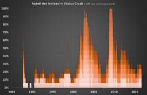 Der Zusammenhang des vorherigen Charts wird noch deutlicher, wenn der Anteil der gerade im Crashmodus befindlichen Aktienindizes dargestellt wird. Es wird hier angenommen, dass sich ein Index im Crashmodus befindet wenn der maximale Verlust mindestens 30% beträgt.