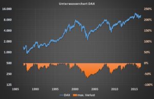 Im Unterwasserchart des DAX ist die Entwicklung des größten und bekanntesten deutschen Aktienindex inklusive seiner Verlustphasen dargestellt.